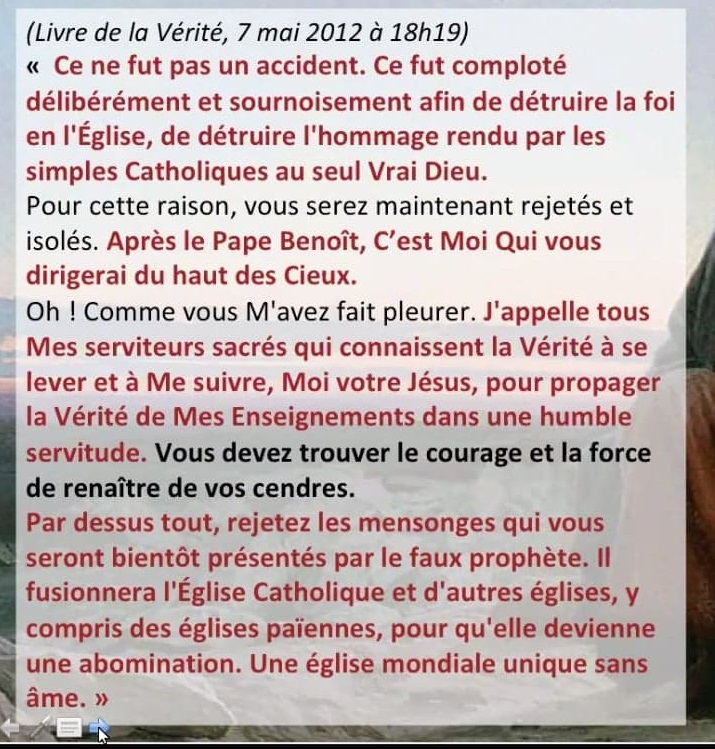DANS MON ÉGLISE LA TEMPÊTE EST COMMENCÉE AVEC L’ ŒCUMÉNISME, LE NOUVEL ORDRE MONDIAL ET LE SCHISME. LA FAUSSE ÉGLISE GRANDE ET RAYONNANTE VA CONQUÉRIR LE CŒUR DE TOUTE L’HUMANITÉ: AVEC SES IDÉES ERRONÉES ET MACHIAVÉLIQUES .