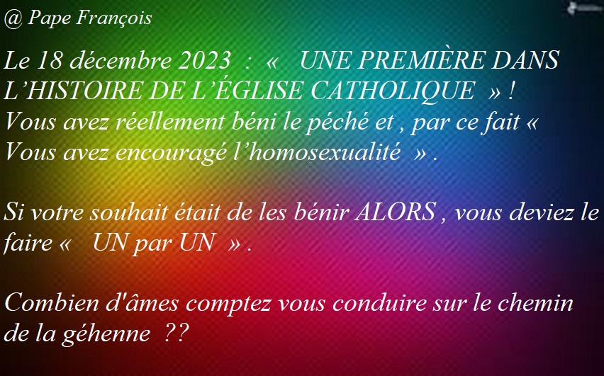 TOUT CE QUI EST SACRE SERA PROFANE ET RIDICULISE . FAITES ATTENTION, « RIEN » DES ÉCRITURES DES COMMANDEMENTS ET DES RÈGLES DE DIEU NE PEUT ÊTRE MODIFIE ! LES SACREMENTS ÉTERNELS ONT ÉTÉ ÉTABLIS PAR DIEU LUI-MÊME !