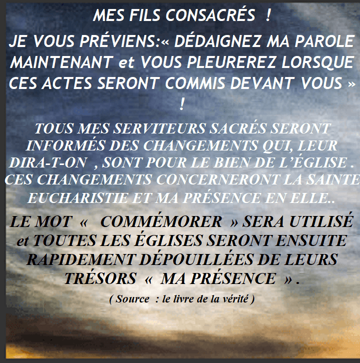 MES ENFANTS : « NE VOUS LAISSEZ PAS INDUIRE EN ERREUR ». JE VEUX QUE MES PRÊTRES PRONONCENT ENCORE ET TOUJOURS LES JUSTES PAROLES CONSACRÉES CAR SINON LA SAINTE MESSE N’EST PAS VALABLE ET, DIEU N’Y EST PAS PRÉSENT !